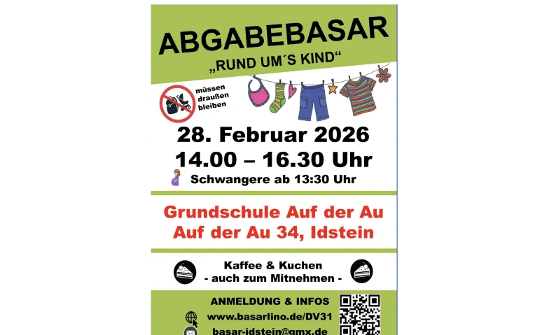 Sortierter Abgabebasar „Rund um‘s Kind“ Frühjahr Grundschule auf der Au, Auf der Au 34, 65510 Idstein Tickets