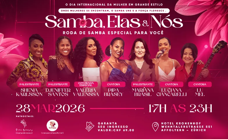 Celebre o Dia Internacional da Mulher em grande estilo, num encontro vibrante onde a força feminina se manifesta através do ritmo contagiante do Samba. Junte-se a nós para uma noite inesquecível com apresentações de Shenia Karlsson, Djeniffer Santos, Mariana Brasil, Cantora Pipa Brasey, Luciana Ciancarelli e Lu Miel, além da presença especial de Valeria Valenssa.
