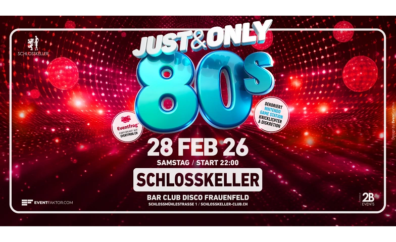 Die JUST & ONLY 80’s verwandelt den Schlosskeller Frauenfeld am Samstag, 28. Februar 2026 in eine Zeitmaschine zurück ins wohl ikonischste Partyjahrzehnt überhaupt! 💜✨