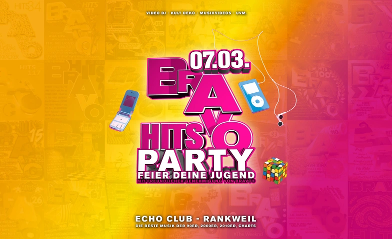 Am Samstag, 07.03.2026 feiern wir die legendäre BRAVO Hits Party – die erfolgreichste CD-Serie der Welt, über 80 Millionen verkaufte Tonträger und die größten Hits aus den 90ern und 2000ern. Das ist die Kult-Party für alle, die auf die besten Songs von damals und heute abgehen! 🌟