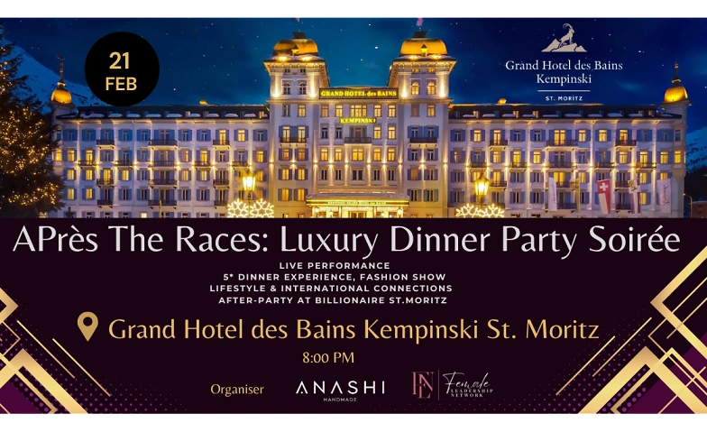 Hosted at the iconic Grand Hotel des Bains, Kempinski St. Moritz, Après The Races Luxury Dinner Soirée promises an unforgettable night set amidst snow-covered peaks, shimmering lights, and the timeless prestige of St. Moritz at its most magical.