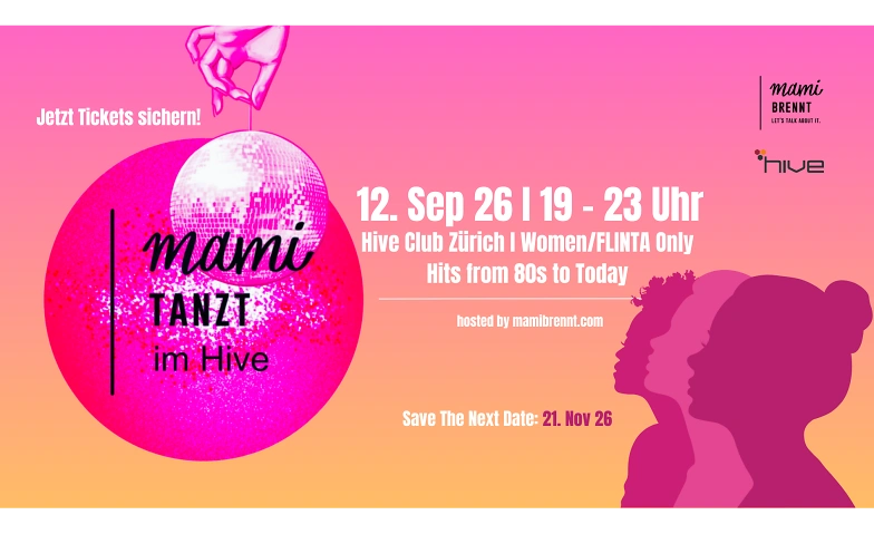 Am 12. September 2026 lädt mamibrennt.com wieder Women Only (ab 21 Jahren) zum frühen Tanzen ins HIVE! (Sorry, Jungs, ihr müsst leider draussen bleiben, zumindest bis 23 Uhr ;-))
