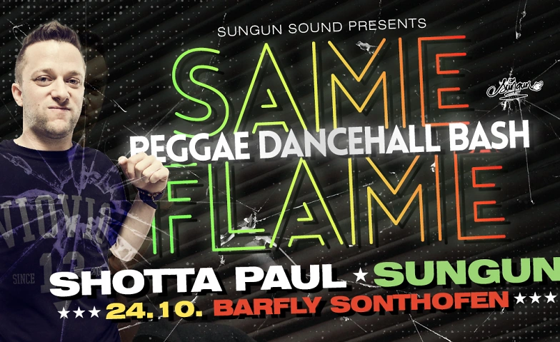 Big tings a gwaan! Der Reggae Dancehall Bash im Barfly Sonthofen geht in die nächste Runde und wird unter neuem Gewand und mit mehr Charakter als SAME FLAME PARTY eingeweiht. Neben den Gastgebern Sungun Sound ist ein big big guest direkt aus Stuttgart zu Gast: SHOTTA PAUL ist jedem in der Reggae-Dancehall Szene bekannt, denn er ist für legendäre shellingz und diverse Abrisse auf globaler Ebene verantwortlich. Umso mehr freuen wir uns, dass er am 24.10. mit im Barfly Sonthofen am Start ist.