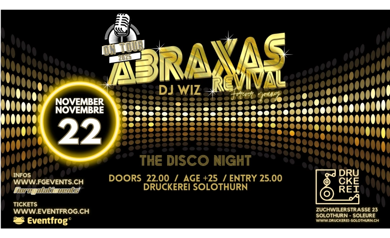 Während das Abraxas normalerweise viele Besucherinnen und Besucher aus Solothurn empfängt, ist es diesmal das Abraxas, das zu ihnen kommt. Am 22. November steigt die Party in der Druckerei ab 22.00 Uhr – ein Abend, der garantiert richtig festlich wird!