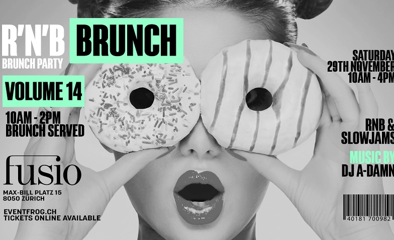 Am 29. November steigt zum 14. mal die RNB BRUNCH PARTY im Fusio Zürich. Wir starten um 10:00 Uhr mit einem köstlichen à la carte Brunch während im hintergrund bereits smoothe RNB-Klassiker zu hören sind. Erlebt eine einzigartige Atmosphäre, während unser DJ die heissesten RNB-Hits von damals und heute auflegt. Stündlich wird die Musik lauter und wir starten unsere Brunch Party!