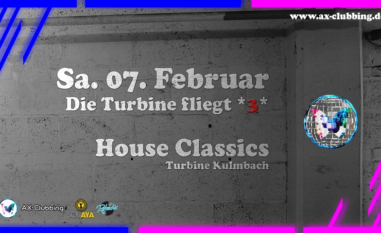 Wir laden euch zum Start in die neue AX Saison am 07. Februar zum dritten mal in eine Traum Location ein. Die Turbine in Kulmbach lässt nicht nur Schmetterlingsherzen höher schlagen. Der alte Turbinen Raum in der alten Spinnerei glänzt nicht nur mit seinem Industrial Stil. Wir freuen uns sehr hier mit euch ein weiteres Mal feiern zu können.