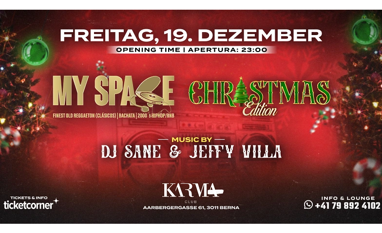 Die MY SPACE – Christmas Edition lädt zu einer besonderen Nacht voller nostalgischer Latin-Beats und urbanen Sounds ein. Freu dich auf eine atmosphärische Weihnachtsfeier, bei der Klassiker, rhythmische Tänze und gute Stimmung im Mittelpunkt stehen. Eine Party, die speziell dafür gemacht ist, Erinnerungen zu wecken, gemeinsam zu feiern und den Dezember mit einzigartigen Vibes zu genießen.