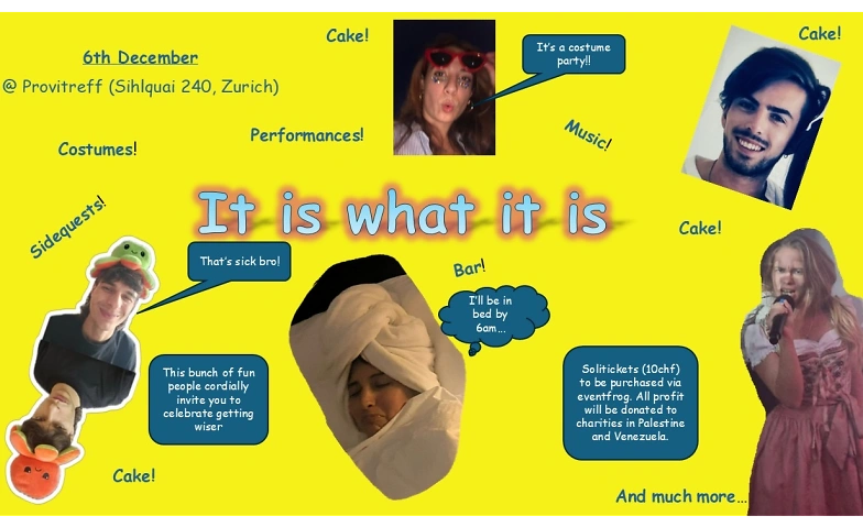 We are turning old and It Is What It Is! We want to celebrate the passage of life and share this moment with you by organising an exciting, magnificent, and wholesome party. We will have a bar, costumes, cake, DJ sets, sidequests and many more surprises.
