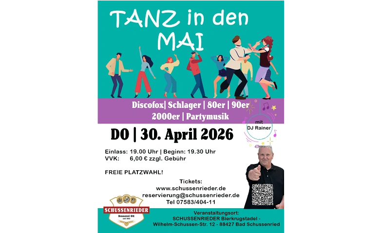 Tanz in den Mai – die Tanzparty im SCHUSSENRIEDER Bierkrugstadel Schlager, Discofox, 80er, 90er, 2000er