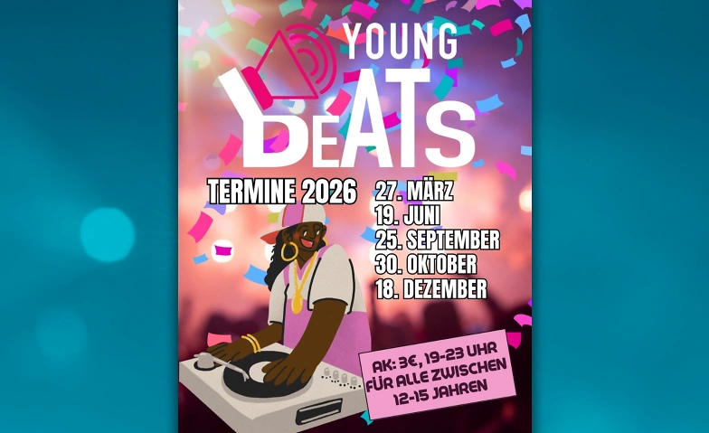 Die WERK°STADT öffnet von 19:00 bis 23:00 Uhr wieder ihre Türen für alle jungen Menschen von 12-15 Jahren. Auf der „Young Beats“, der Jugendparty von und mit Jugendlichen, wird wieder gemeinsam gefeiert. Also holt eure schicksten Outfits aus dem Schrank und macht die Nacht unvergesslich. Ihr könnt euch auf fantastische Musik freuen, die eure Beine zum Tanzen bringt. Oder ihr genießt einfach die gute Stimmung mit erfrischenden Getränke beim Quatschen.