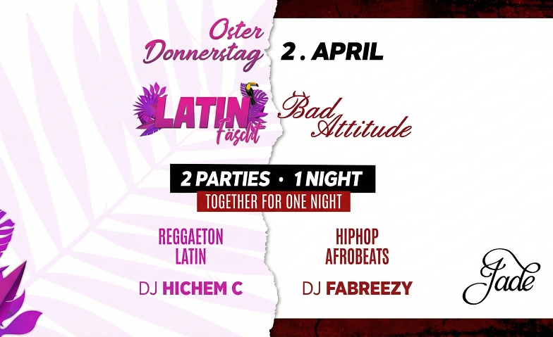 Unter dem Motto „2 Parties – 1 Nacht“ vereinen sich zwei der angesagtesten Eventlabels der Stadt – Latin Fäscht und Bad Attitude – für ein einmaliges Erlebnis. Es ist die letzte Gelegenheit, die unvergleichliche Atmosphäre des Mascotte Clubs zu spüren, zu tanzen, zu feiern und Geschichte zu schreiben. Die Gäste erwartet eine wilde Fusion: Latin Beats & Reggaeton Vibes treffen auf Urban Sounds, Hip-Hop & Afro Tunes. Zwei Welten, ein Club, eine Nacht – die perfekte Symbiose, die Zürich so noch nicht erlebt hat.