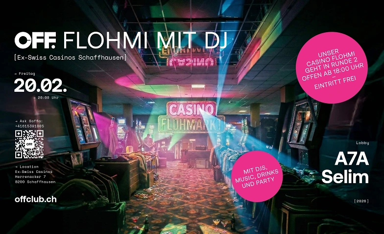Unser Casino-Flohmarkt mit DJ und Party geht in die zweite Runde! Es warten noch viele tolle Schnäppchen darauf, von euch entdeckt zu werden. Wir öffnen am Freitag, dem 20. März 2026, um 18 Uhr unsere Türen. Entdeckt Schätze aus dem ehemaligen Swiss Casinos am Herrenacker 7 in Schaffhausen. Von antiken Möbeln und Schirmständern über Kupferraritäten, Bürostühle, hochwertige Überwachungskameras und Bildschirme bis hin zu Kronleuchtern und Deko- sowie Sammlerstücken ist alles dabei. Viele der Artikel, die aktuell noch im OFF.Pop-up-Club im Gebrauch sind, können bereits erworben werden, die Abholung erfolgt jedoch erst nach Ende der Pop-up-Phase. Geniesst die entspannte Atmosphäre bei feinen Drinks und guter Musik mit den stadtbekannten DJs A7A & Selim bis tief in die Nacht. Der Eintritt ist zwischen 18:00 und 22:00 Uhr kostenlos.