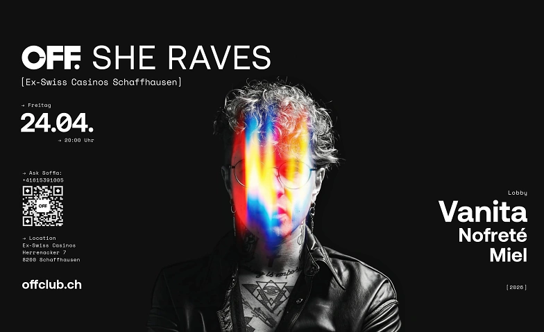 Aufgrund der grossen Nachfrage präsentieren wir euch an unserem Closing-Weekend am Freitag, dem 24. April 2026, erneut ein reines Female-DJ-Line-up im "OFF." Pop-up-Club. Nach unserer Umfrage war schnell klar, welche Namen euch am meisten begeistern. An der Spitze steht keine Geringere als DJane Vanita. Ohne zu zögern haben wir sie gleich wieder für euch gebucht. Mit von der Partie sind ausserdem Nofreté, die Powerfrau aus St. Gallen, und das Nachwuchstalent Miel aus Zürich, deren Fangemeinde bis in die Ostschweiz reicht. Im Vordergrund stehen kollektive Energie, Empowerment und kompromissloser Sound – ein klares Zeichen für mehr Sichtbarkeit und Gleichberechtigung in der DJ-Szene. Diese Nacht wird von einer offenen und respektvollen Community getragen und bietet im ehemaligen Swiss Casino Schaffhausen am Herrenacker 7 viel Platz für die Liebe zur elektronischen Musik.