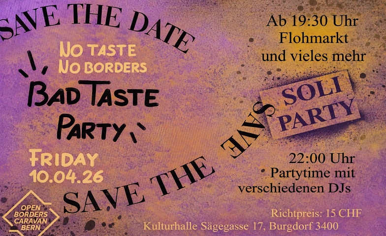Am Freitag, 10. April 2026, lädt die Kulturhalle Sägegasse zur „No Taste No Borders“-Bad Taste Party ein – organisiert von Open Borders Caravan Bern als Soli-Event für Menschen auf der Flucht.​