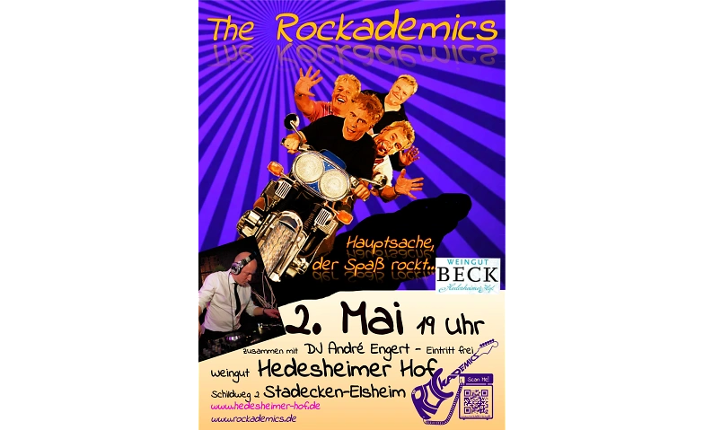 WEINPARTY - die Winebeats von DJ André Engert treffen die Marshall-Verstärker der "Rockademics". Heißt für Euch: Ein Abend zum Nonstop-Feiern im "Hedesheimer Hof". André sorgt für die Winebeats; die "Rockademics" für tolle Live-Songs in Rockademics-eigener Handschrift. Feiern ohne Pause bis in die tiefe Nacht...