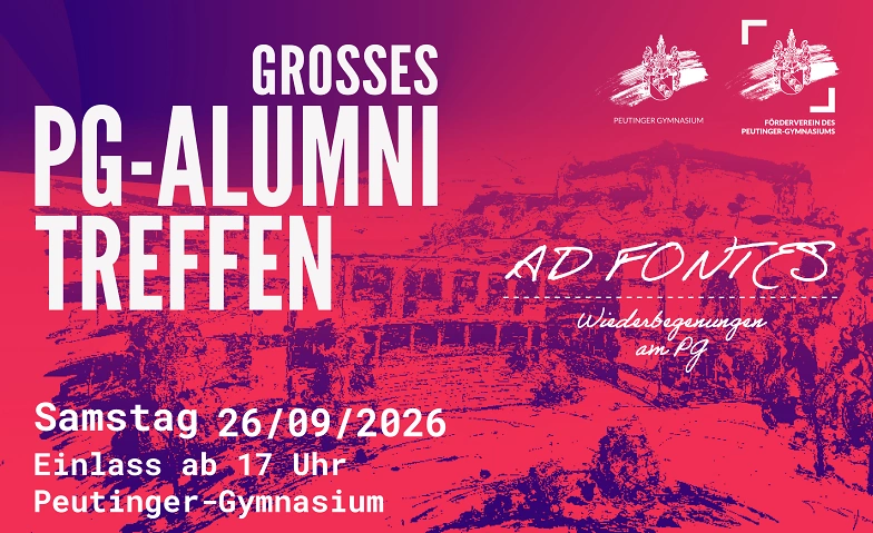 Feiern Sie mit uns unter dem Motto »Ad fontes« - Wiederbegnungen am PG das große PG-Alumnitreffen am 26. September 2026. Treffen Sie Freundinnen und Freunde aus ihrer Schulzeit und entdecken sie ihr altes Peutinger-Gymnasium neu: Tradition trifft Zukunft. Mit der Landesgartenschau in Ellwangen 2026 erhält das Fest zugleich einen würdigen Anlass wie einen blühenden Rahmen.