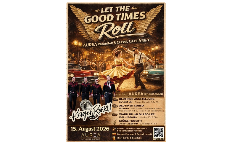 Traditionell gehört der dritte Samstag im August im AUREA Rheinfelden dem Thema Oldtimer und Rock'n'Roll. Am Nachmittag zeigen sich die Oldtimer der 50s, 60s und 70s auf der Ausstellung und dem Oldtimer Corso durch die Altstadt von Rheinfelden. Ab 18.30 Uhr gehört dann der Abend dem Rock'n'Roll und den Boogie und Jive Tänzer:innen mit ihren schönen Kleidern. Dazu gibt es eine 100m2 grosse Tanzfläche und viel Platz zum Sitzen und Feiern. Perfekt für eine super Openair Tanzvergnügen mit Freunden.