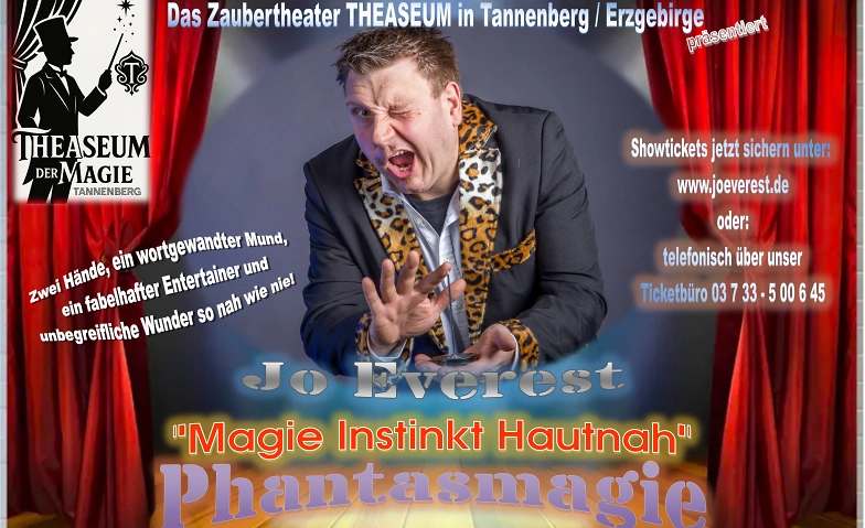 Tauchen Sie ein in eine Welt voller Illusionen, Magie und faszinierender Momente: Die Show Phantasmagie im Theaseum begeistert mit einzigartigen Effekten und außergewöhnlicher Bühnenkunst. Meistermagier Jo Everest führt Sie durch einen phantastischen Abend, den Sie so schnell nicht vergessen werden.