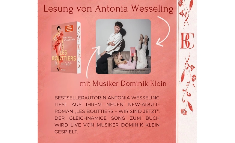 Antonia Wesseling wird aus ihrem Buch "LES BOUTTIERS - WIR SIND JETZT" lesen und dabei spannende Einblicke in die Geschichte, ihre Figuren und den Entstehungsprozess geben. Ein absolutes Highlight des Abends: Der offizielle Song zum Buch wird live vom Musiker Dominik Klein performt und verleiht der Geschichte eine zusätzliche emotionale Tiefe. Literatur und Musik verschmelzen zu einem einzigartigen Erlebnis.