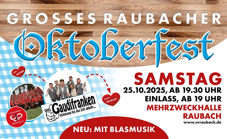 Ab 19:30 Uhr (Einlass ab 19 Uhr) heizen wir euch in der Mehrzweckhalle Raubach mit viel guter Stimmung, bayrischen Spezialitäten und Musik-Acts der Spitzenklasse ein! Den Start in den Abend begleiten die St. Georgsbläser aus Haiderbach mit zünftiger Blasmusik. Erstmals in Raubach zu Gast sein wird im Anschluss die bekannte Partyband "Die Gaudifranken" aus dem Süden Deutschlands.