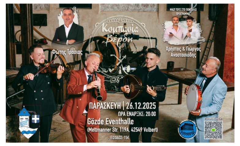 • Κομπανία Βέρδη - Μια από τις πιο αυθεντικές και αγαπημένες κομπανίες της παραδοσιακής μουσικής, με πλούσιο ρεπερτόριο από την Ήπειρο, τη Μακεδονία και τη Θράκη. Η εμπειρία και η αγάπη τους για την παράδοση υπόσχονται μια αξέχαστη βραδιά με τραγούδια που όλοι έχουμε αγαπήσει.