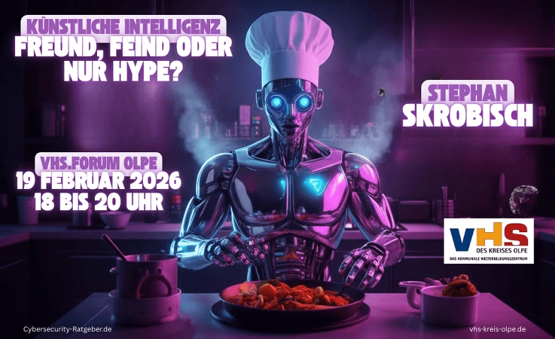 Tickets unter: https://www.vhs-kreis-olpe.de/kurssuche/kurs/Kuenstliche-Intelligenz-Freund-Feind-oder-nur-Hype/261-111016