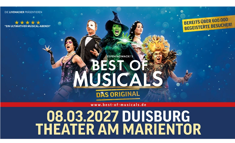 Search Filters Events in which will take place Tomorrow Today in Concerts Concerts / Church music Concerts / Hard Rock & Heavy Metal Fairs Fairs / Fair Health & Spirituality Health & Spirituality / Health & Wellbeing Musicals & Shows Musicals & Shows / Musical Theatre & Stage . Reset filters Musical in Duisburg Top places Berlin Bielefeld Bonn Dortmund Dresden Duisburg Hamburg Hannover Koblenz Lübeck Mannheim München Münster Osnabrück Passau Regensburg Saarbrücken Stuttgart Würzburg Register your event Event group until Oct 11 Shanty-Chor im Mattlerhof 2026 4 Events Brauhaus Mattlerhof , Duisburg (DE) Mar 8 Best of Musicals 08 March, Monday, 20:00 Best of Musicals Duisburg, Duisburg (DE) Missing your event? Register your event with just a few clicks here and benefit from additional marketing opportunities. Create event