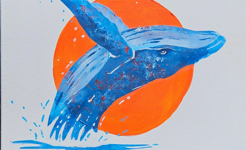 Farbenprächtig umgesetzt in einer semi-realistischen Malweise, die zwischen naturalistischer Darstellung und expressiver Farbsetzung pendelt. Die spritzige Form des Wals wird durch Schablonetechnik und verschiedene kräftige Pinselstriche modelliert.