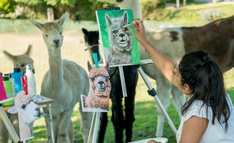 Nach der Malstunde, wenn die Bilder trocknen, bleibt dann noch genug Zeit, um mit den flauschigen Alpakas auf Tuchfühlung zu gehen und ein Erinnerungsfoto an den tollen Tag zu schießen.