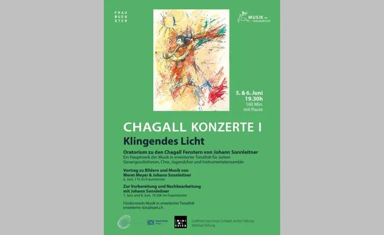 Rahmenprogramm im Fraumünster zu den beiden Konzerten «Klingendes Licht»: Montag 1. Juni | 19.30h | Abend zur Vorbereitung mit Johann Sonnleitner Samstag, 6. Juni | 11h | Vortrag zu Bildern und Musik mit Meret Meyer und J. Sonnleitner Montag 8. Juni | 19.30h | Abend zur Nachbereitung mit J. Sonnleitner Ensemble: «Klingendes Licht», Oratorium in erweiterter Tonalität für sieben Gesangssolisten:innen, Chor, Jugendchor und Instrumentalensemble, Orgel und Schlagzeug. Die fünf Chagall-Fenster im Fraumünster haben den Komponisten zu diesem Oratorium angeregt. Die den Bildmotiven zugrunde liegenden Bibelstellen bilden die Textgrundlage. Es ist ein Hauptwerk der Musik in erweiterter Tonalität: Die Solostimmen und Instrumente musizieren unter Einbezug der Ur-Intervalle 11/8-Quart, 13/8-Sext und 14/8-Septime, was der Musik eine ungeahnte Lebendigkeit und Farbigkeit verleiht: Klingendes Licht.