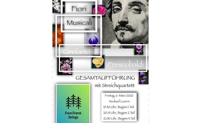 Weltpremiere, Frescobaldis Meisterwerk " Fiori Musicali" eingerichtet für Streichquartett wird an einem Abend aufgeführt.