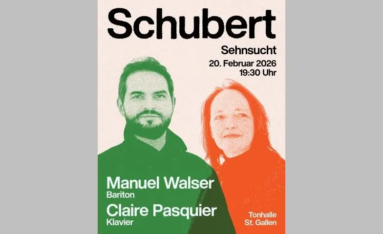 Totengräbers Heimweh D 842 Ensemble: Manuel Walser – Bariton Claire Pasquier – Klavier Leitung: Der Liederabend Sehnsucht ist ganz der Liedkunst von Franz Schubert gewidmet. In ausgewählten Liedern entfaltet sich ein vielschichtiges Panorama menschlicher Empfindungen: innige Nähe, existenzielle Einsamkeit, Naturerfahrung und die leise Hoffnung auf Trost. Der Bariton Manuel Walser und die Pianistin Claire Pasquier widmen sich diesem Programm als langjähriges Liedduo. Gemeinsam gestalten sie einen Abend, der Schuberts feinsinnige Verbindung von Text und Musik in all ihrer emotionalen Tiefe hörbar macht. Die Auswahl reicht von bekannten Liedern wie Du bist die Ruh und Frühlingsglaube bis zu dramatischen Balladen und dunkleren Nachtstücken. Ein konzentrierter Liederabend, der Schuberts Musik als zeitlose Sprache der Sehnsucht erfahrbar werden lässt.