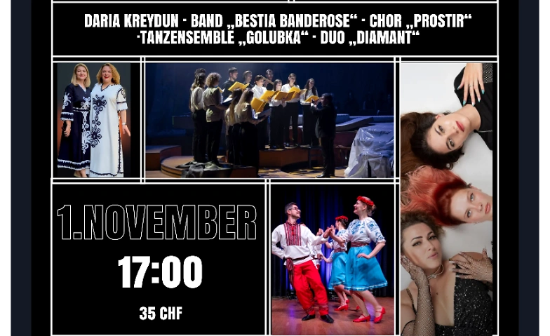 Freuen Sie sich auf den Auftritt der beeindruckenden Tänzerin Daria Kreydun, Solistin des weltberühmten Pavlo-Virsky-Ensembles, die mit atemberaubenden und anspruchsvollen Choreographien begeistert. Das Trio „Bestia Banderose“ sorgt in farbenprächtigen Kostümen mit modernen Interpretationen weltbekannter Hits für Stimmung. Der Chor „Prostir“ aus Luzern verzaubert mit eindrucksvoller Mehrstimmigkeit, während das Tanzensemble „Golubka“ (Zürich) die Bühne mit Energie und farbenfrohen Kostümen zum Leben erweckt. Das Duo „Diamant“ entführt Sie mit A-cappella-Gesang in die Welt authentischer ukrainischer Musik.