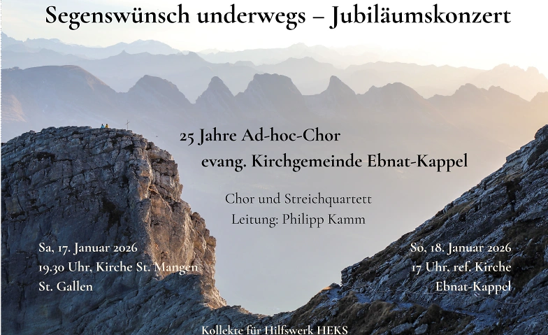 Der Ad-hoc-Chor der evang.-ref. Kirchgemeinde Ebnat-Kappel feiert sein 25-jähriges Unterwegssein als Chorgemeinschaft mit zwei Benefizkonzerten - und einer Reise zurück zu den ersten Eigenkompositionen: Die "Segenswünsche" (2006) sind vertonter Zuspruch an uns alle, mal fröhlich beschwingt, mal meditativ, mal aufrüttelnd. In "underwegs" (2008) steht die universelle Erfahrung unseres Daseins als ein Lebens-Weg im Mittelpunkt, mit Aufbrüchen, Hindernissen, Gratwanderungen, Zwischenhalten und Weggefährten.