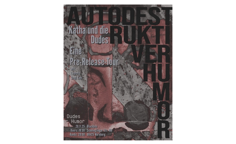 Katha und die Dudes präsentieren mit Autodestruktiver Humor ihr erstes vollständiges Album – eine musikalische Abhandlung zwischen Manie, Depression, Aufbruch und Überforderung in Zeiten von Isolation und Identitätskrise.Dabei kreieren die (Wahl)berliner:innen eine eklektische Mischung aus quirligem Indie, ein bisschen NDW und 2000er-Deutschpoprock – irgendwo zwischen Isolation Berlin, Wir sind Helden und Ideal, mit Texten irgendwo zwischen Schmerz und Sarkasmus, Melancholie, Gesellschaftskritik und zartem, autodestruktiven, Humor.