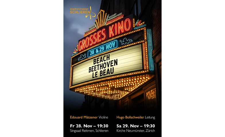 Beach, Beethoven und Le Beau. Im Programm GROSSES KINO geht es nicht etwa um Hitchcock oder Walt Disney, nein, wir widmen uns Grössen der Musikgeschichte! Beethovens Violinkonzert gilt als Vorbild für Generationen von Komponist:innen. Beach und Le Beau haben beide ebenfalls Grosses gewagt: Beide Frauen schrieben wunderbare Werke für grosse sinfonische Besetzungen – eine Domäne, die ihre männlichen Zeitgenossen gerne für sich beanspruchten. Hat sich das heute geändert? Werden Programme mit grossem Frauenanteil irgendwann zur Normalität? Wir hoffen es und beginnen mit einem Kino für die Ohren!