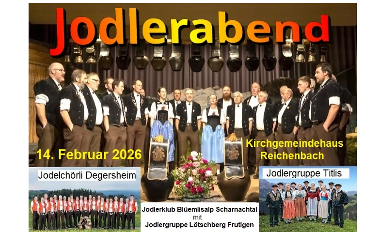 Der Jodlerklub Blüemlisalp Scharnachtal, verstärkt durch die Jodlergruppe Lötschberg Frutigen, lädt am 14. Februar 2026 um 20:15 Uhr ins Kirchgemeindehaus Reichenbach ein zu einem urchigen Jodelkonzert mit Jodelliedern und Naturjütz.