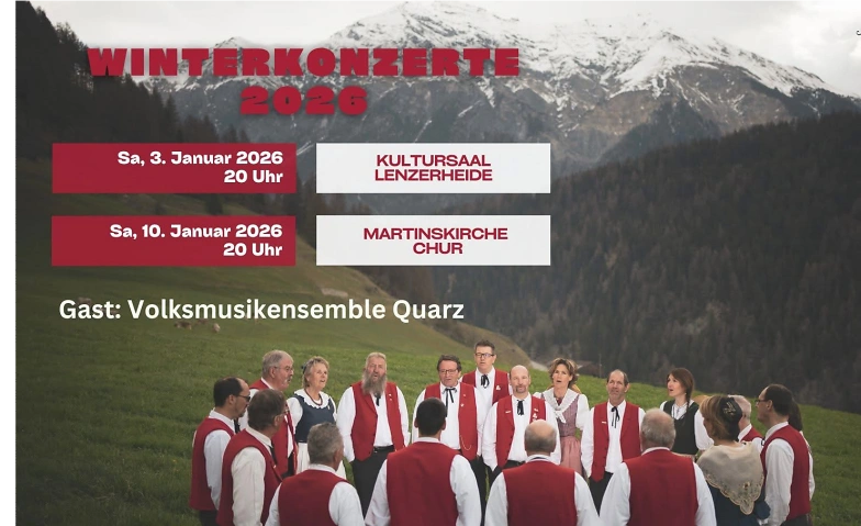 Das Älplerchörli Obervaz aus der Lenzerheide präsentiert gemeinsam mit Quarz einen Abend voller authentischer Volksmusik. Dazu gibts Auftritte der Fifferlottas pintgas und kleinerer Formationen aus dem Älplerchörli.