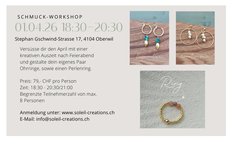 Ich zeige dir Schritt für Schritt, wie du deinen Schmuck kreierst, unterstütze dich mit Tipps für schöne Designs und stehe dir während des ganzen Workshops zur Seite.