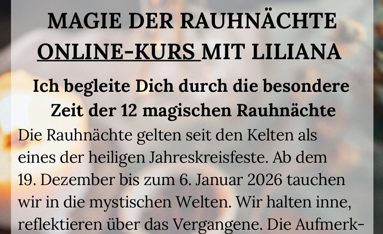 Die Rauhnächte gelten seit den Kelten als eines der heiligen Jahreskreisfeste. Ab dem 19. Dezember bis zum 6. Januar 2026 tauchen wir in die mystischen Welten. Wir halten inne, reflektieren über das Vergangene. Die Aufmerksamkeit gilt vor allem auf unsere Wünsche und Intentionen für das neue Jahr 2026.