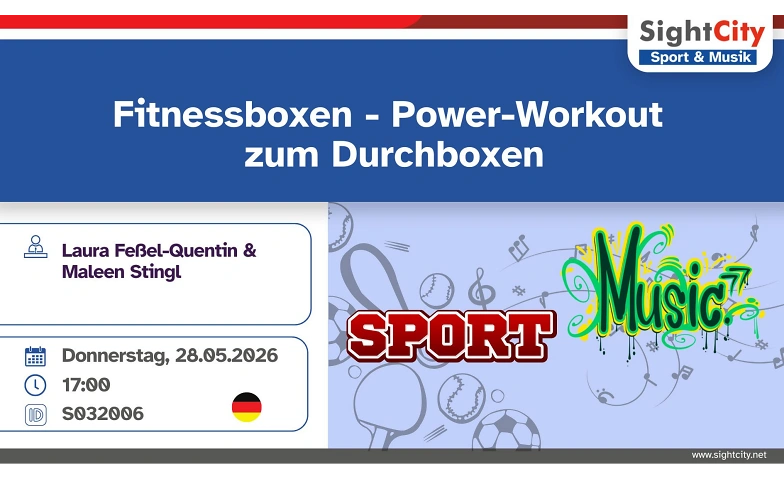 Grafik zur SightCity Sport & Musik mit dem Titel „Fitnessboxen – Power-Workout zum Durchboxen“. Zu sehen sind außerdem die Namen Laura Feßel-Quentin und Maleen Stingl sowie Datum, Uhrzeit 17:00 und die Kennung S032006.