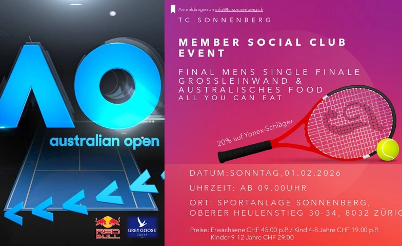 Australien Open  Final Single Mens  Grossleinwand Live Sportanlage Sonnenberg, Oberer Heuelsteig 30, 8032 Zürich Tickets