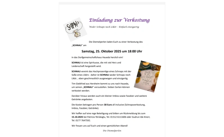 Einladung zur Verkostung - SCHNALI, Alte Lange Straße 6, Liebenau, DECategory: Eating & Drinking