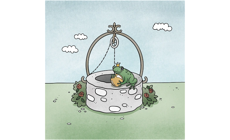 Die hübsche, junge Prinzessin spielt im Schlossgarten mit ihrer goldenen Kugel, die ihr plötzlich aus den Fingern gleitet und in den tiefen Schlossbrunnen fällt. Verzweifelt und bitterlich weinend um den Verlust ihres liebsten Spielzeugs erscheint wie aus dem Nichts ein Frosch an der Wasseroberfläche. Er bietet der Prinzessin an, die Kugel für sie aus dem Brunnen zu holen, aber nur, wenn sie ihn im Gegenzug als gleichwertigen Spielkameraden anerkennt und Tisch und Bett mit ihm teilt. Die Prinzessin willigt ein. Als der Frosch mit der Kugel an die Oberfläche zurückkehrt, schnappt sie sich die Kugel und rennt ins Schloss zurück.