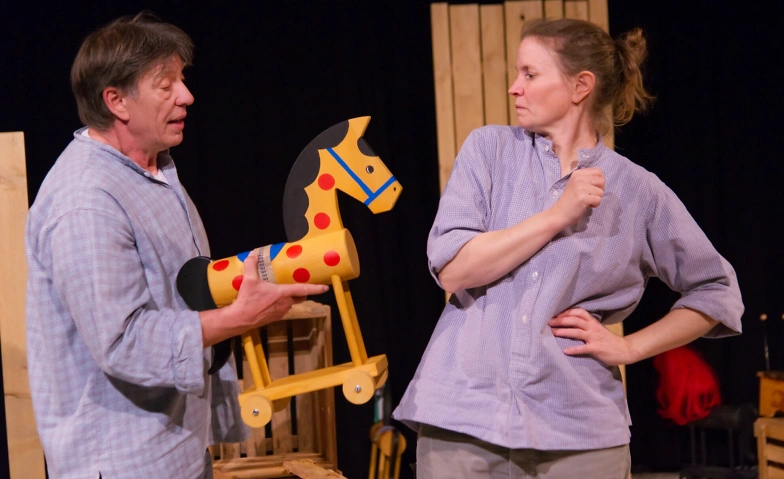 Eine Schauspielerin, ein Schauspieler und ein Musiker erzählen und spielen die bekannte Geschichte des Rösslein Hü neu. Sie schlüpfen in die verschiedensten Rollen und lassen das Publikum Freuden und Leiden des Holzrössleins miterleben: etwa, wenn es mit Zirkuselefant Jumbo in der Arena auftritt, als Rennpferd um den Sieg rennt, in einem reissenden Fluss den Kopf verliert oder sich aus einem eingestürzten Bergwerk befreien muss.
