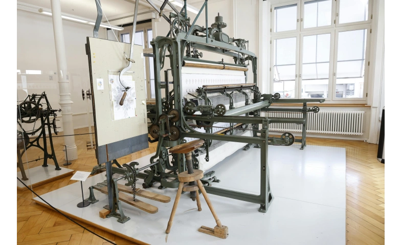 Unsere aus dem Jahr 1890 erhaltene Handstickmaschine ist eine der wenigen noch funktionsfähigen und damit ein Highlight der Sammlung. Als eine Schulmaschine hat sie eine Länge von 2,25m und ist mit 156 Nadeln bestückt.