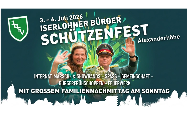 Vom 3. bis 6. Juli 2026 verwandelt sich die Alexanderhöhe wieder in das pulsierende Herz unserer Stadt. Das Iserlohner Bürgerschützenfest lädt dich ein, Teil einer Tradition zu werden, die Generationen verbindet und die Waldstadt jedes Jahr aufs Neue zum Strahlen bringt.