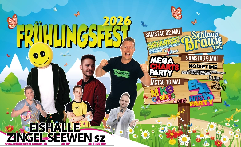 Aloa in den Talkessel Schwyz, wo die wunderschöne Eishalle Zingel in Seewen zur 19. Ausgabe des Frühlingsfestes wartet.  Drei Samstage im Mai "PARTY PUR" Für alle Tage gilt das Mindestalter von 18. Jahren. Die Gratisparkplätze sind max. 5 Gehminuten von der Halle entfernt. Mit einem Eintrittspreis von 20.- Fr. pro Abend bist du auch dieses Jahr live dabei. Wir freuen uns, dich an den heissesten Tagen im Frühling bei uns begrüssen zu dürfen. Let's get the party startet!