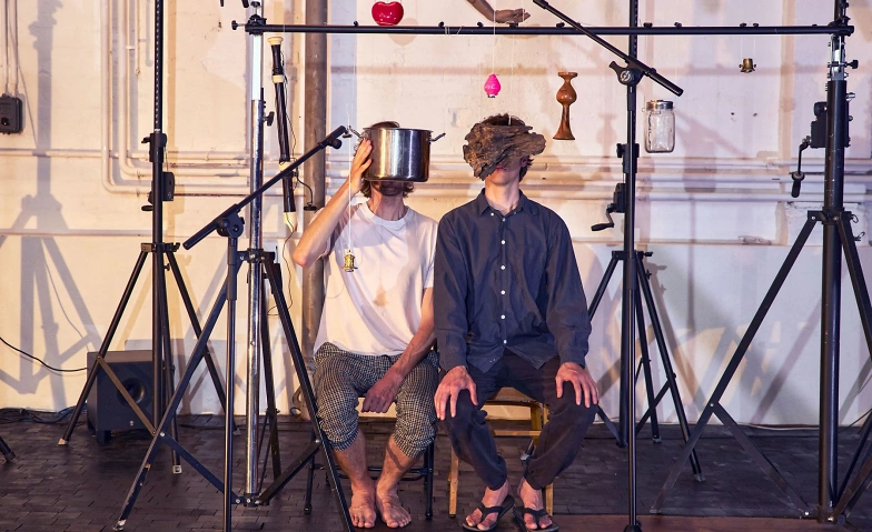 Das Duo OSZILOT lässt sich von der Vorstellung leiten, dass Gegenständen ein eigener Geist innewohnt. Die beiden statten Spüli-Flaschen und Angelrouten, Gummiherzen und Holzhocker mit Sensoren aus, die jede Bewegung in Klang übersetzen. So schaffen sie eine skurrile Pendel-Performance-Konstruktion, die Klang, Physik, Installationskunst und Musiktheater miteinander vereint: ein Mobile als analoge Drum-Machine, ein gespenstisches Luftballett, in dem sich die Performer und ihre scheinbar unbelebten Objekte wortlos verständigen.