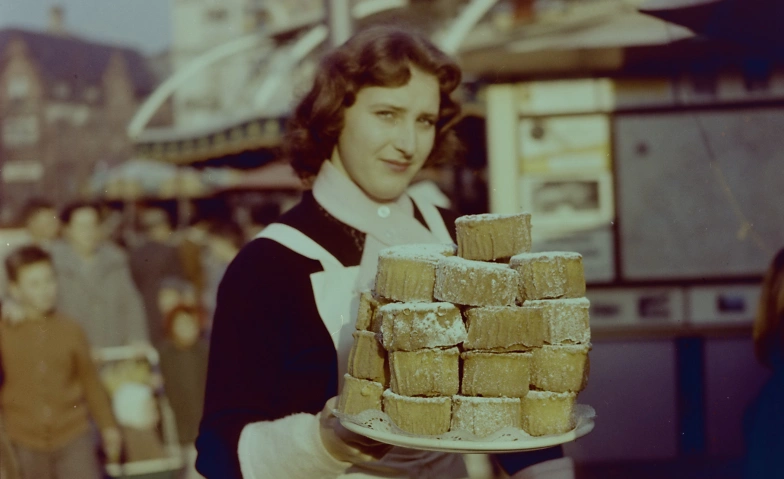 Credits: Frau mit einem Teller «Rosekiechli» an der Basler Herbstmesse, 1950er-Jahre. Foto Jeck Basel. StABS, BSL 1060c 3/8/377